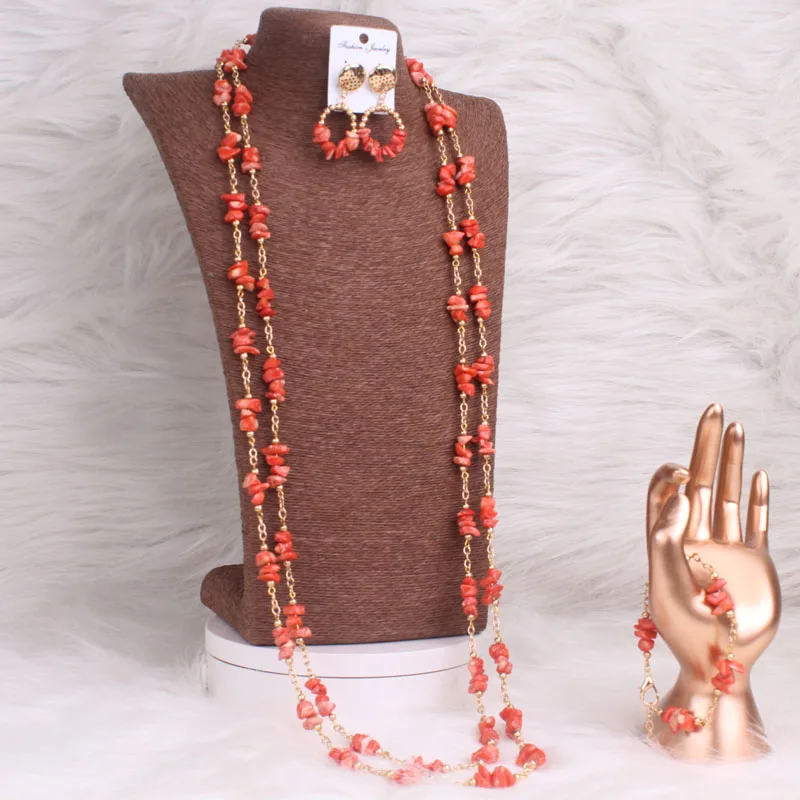 4ujewelry Nigerian Coral Beads Necklace Women Bridal Jewelry Sets Wedding Long Design 3 Pieces